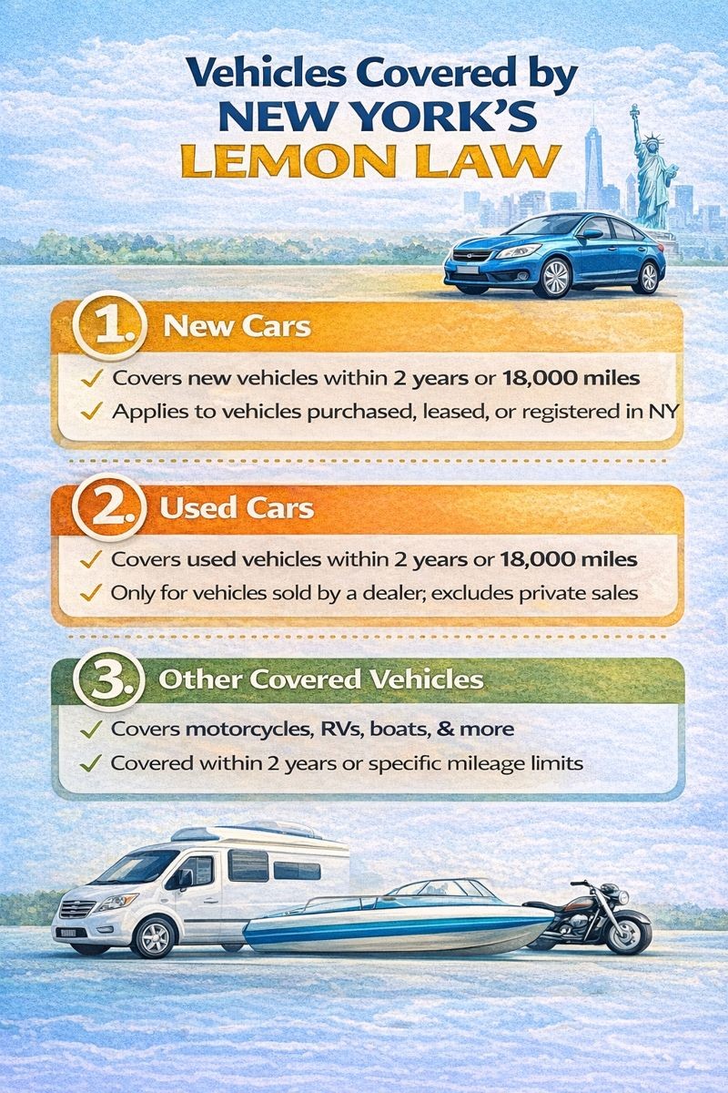 The New York Lemon Law can apply to new cars, used cars, leased vehicles, cars purchased or leased in New York. Coverage depends on vehicle type, mileage, and warranty requirements.